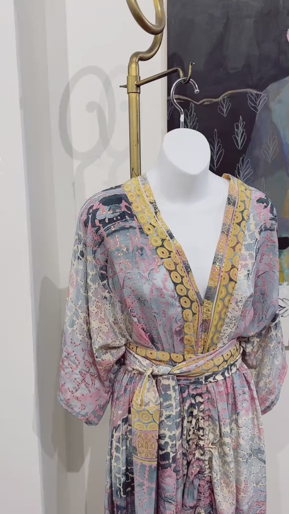 The Haven Dress – elegance meets boho-chic inThe Haven Dress. Crafted from luxurious silk-blend end-of-roll fabrics and meticulously made in India by master artisans, this flowy dress features wide kimono sleeves for graceful movement, an elastic waist for comfort, and a wide tie belt with delicate ruching at the front to adjust the length to your preference. Designed to flatter most sizes S–XL, The Haven Dress is a versatile, one-of-a-kind piece that embodies refined ease and sustainable luxury.