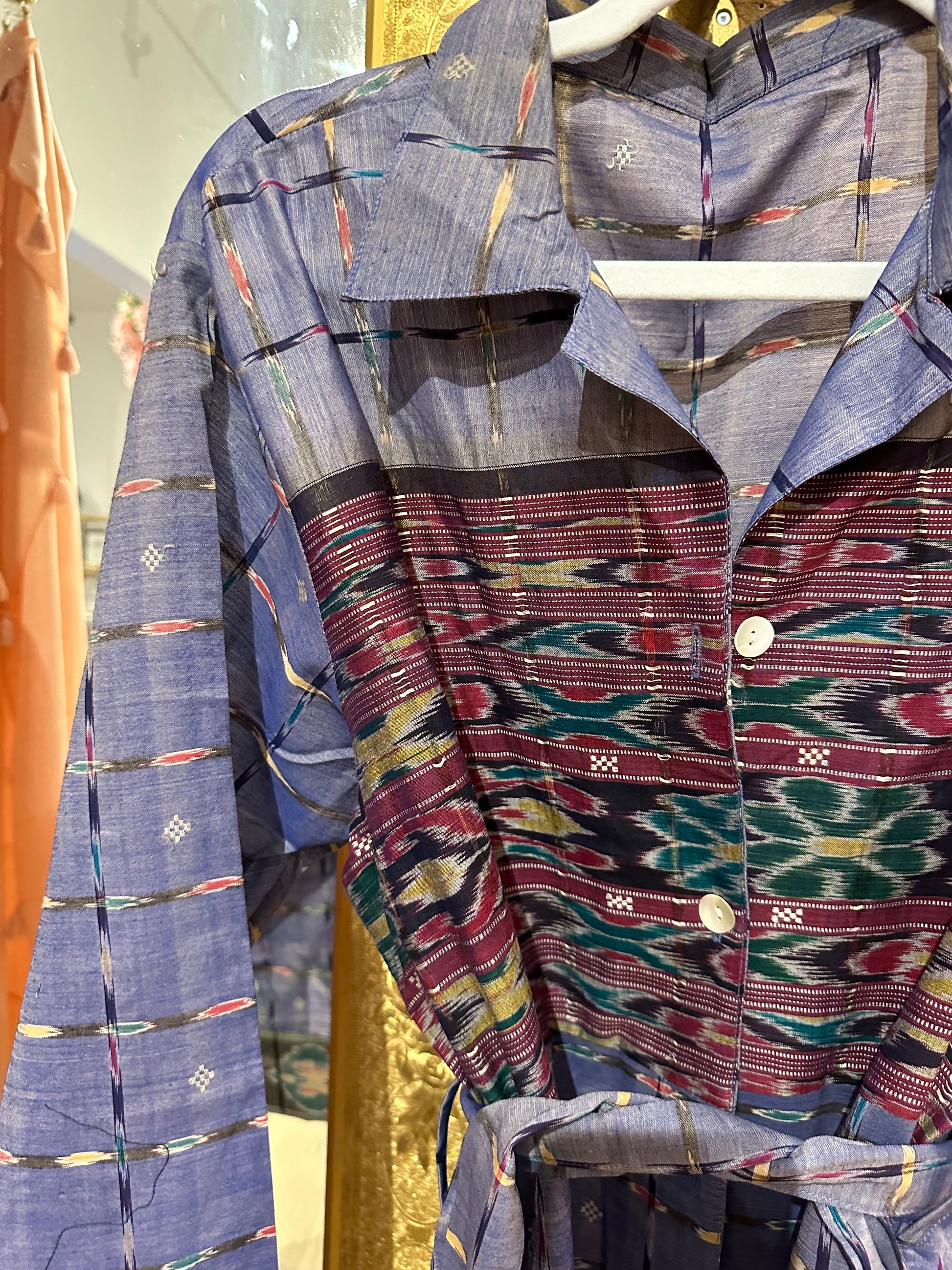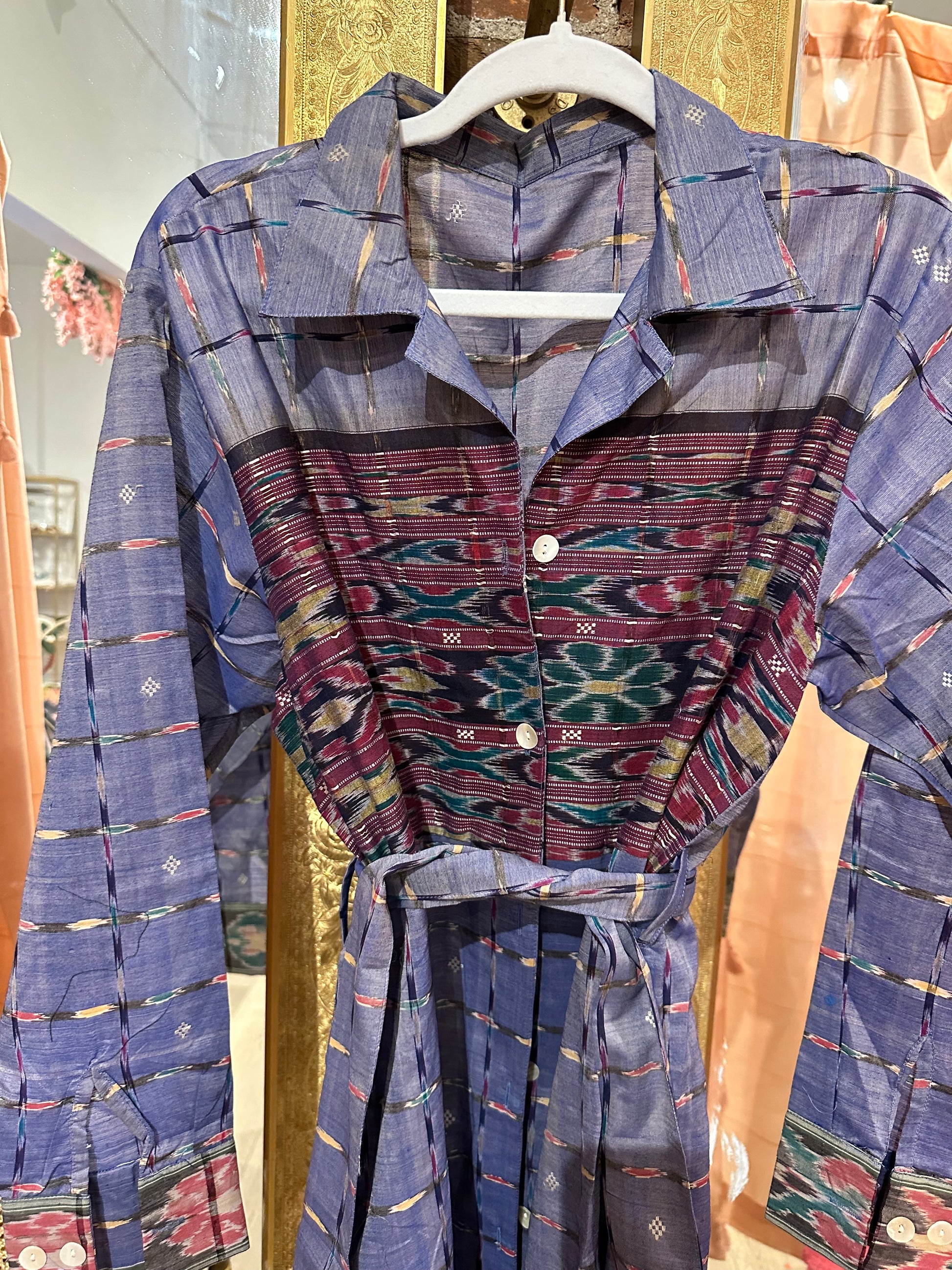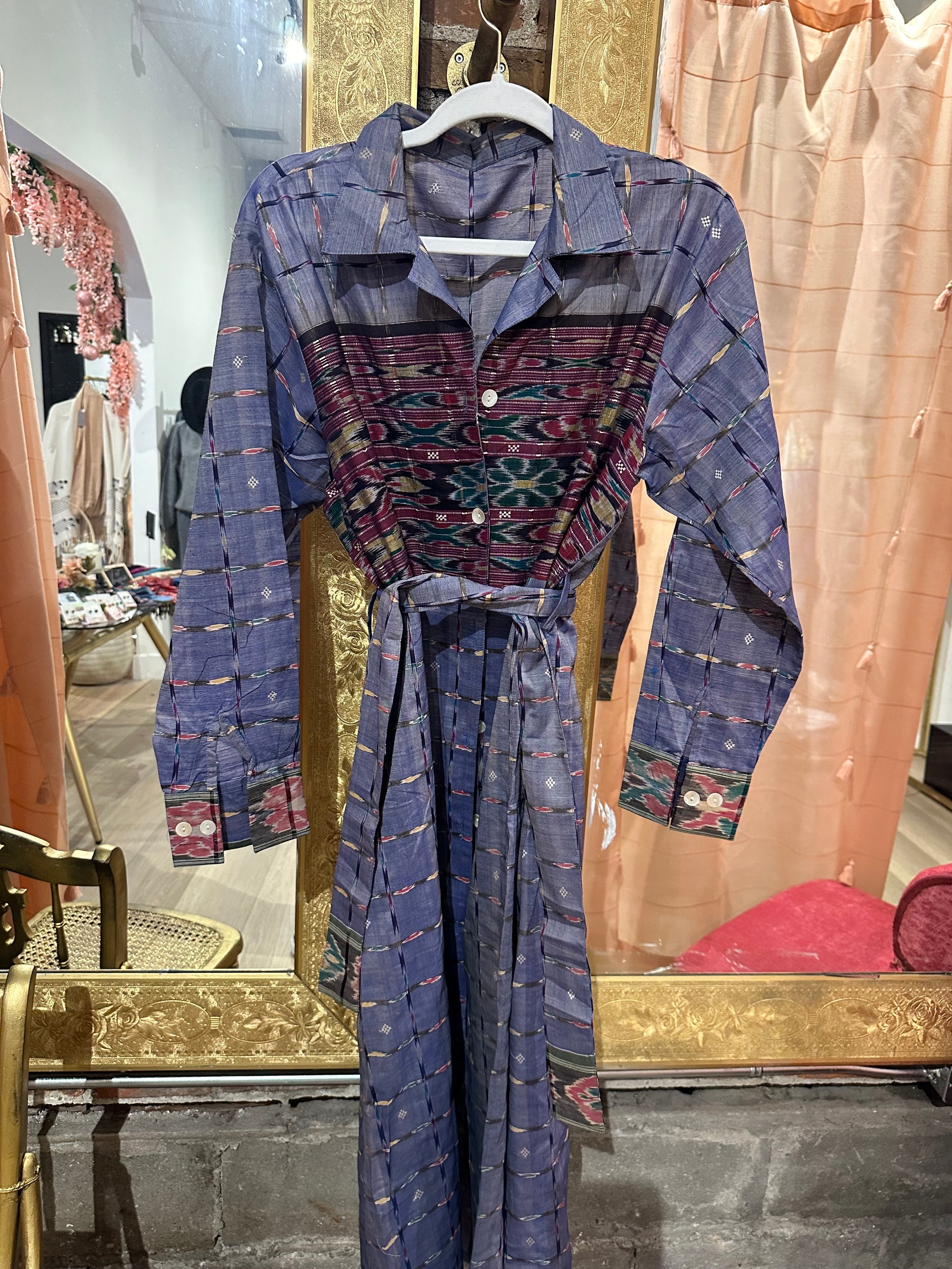 Designed in house and made my master tailors in India, our maxi a line shirt dresses are made from vintage cottons and silks. Exquisitely detailed with pearl buttons and the skirt has a beautiful and flattering a line shape. Wear these as a stand alone dress or open over dress pants or jeans