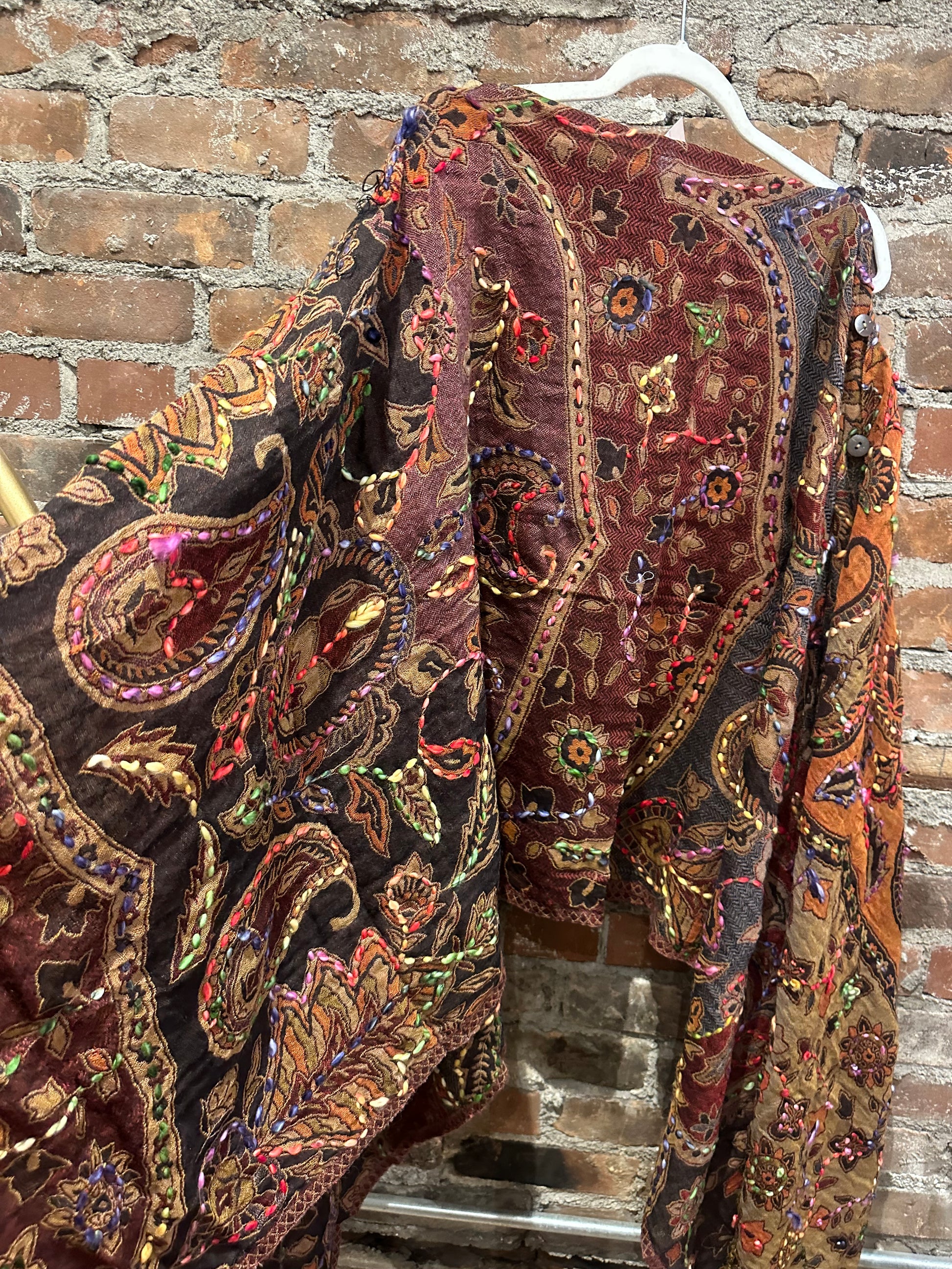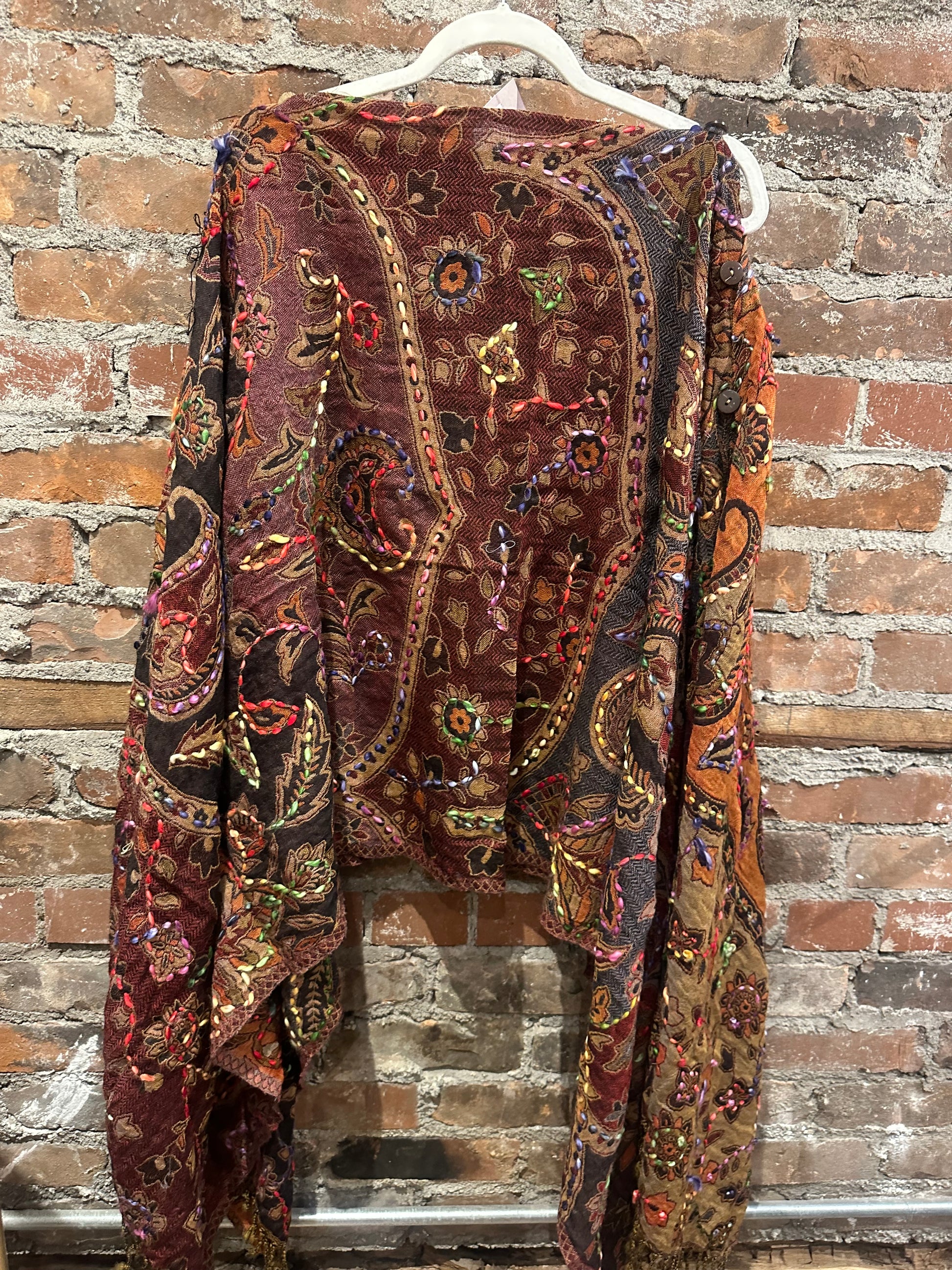 Stunning embroidered pure wool cape with buttons. Can be worn as a cape or turn it with buttons at the front like a cardigan. Reverse to the other side to get a slightly different colour!