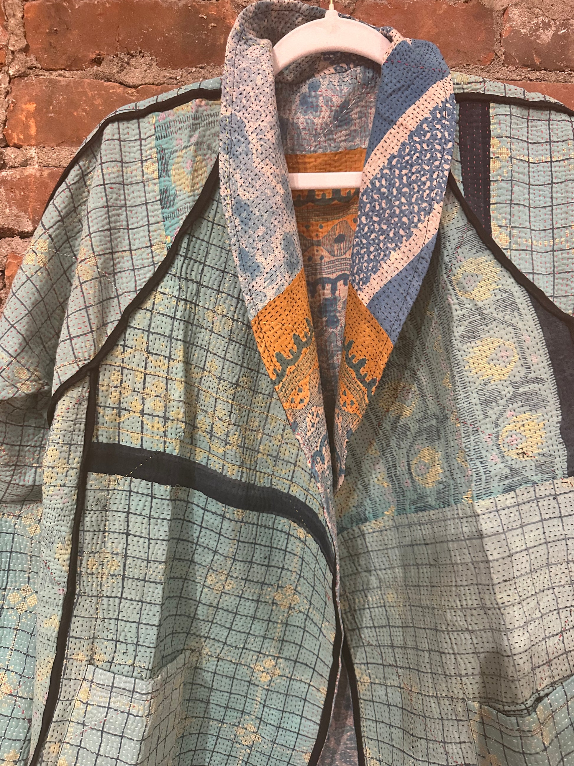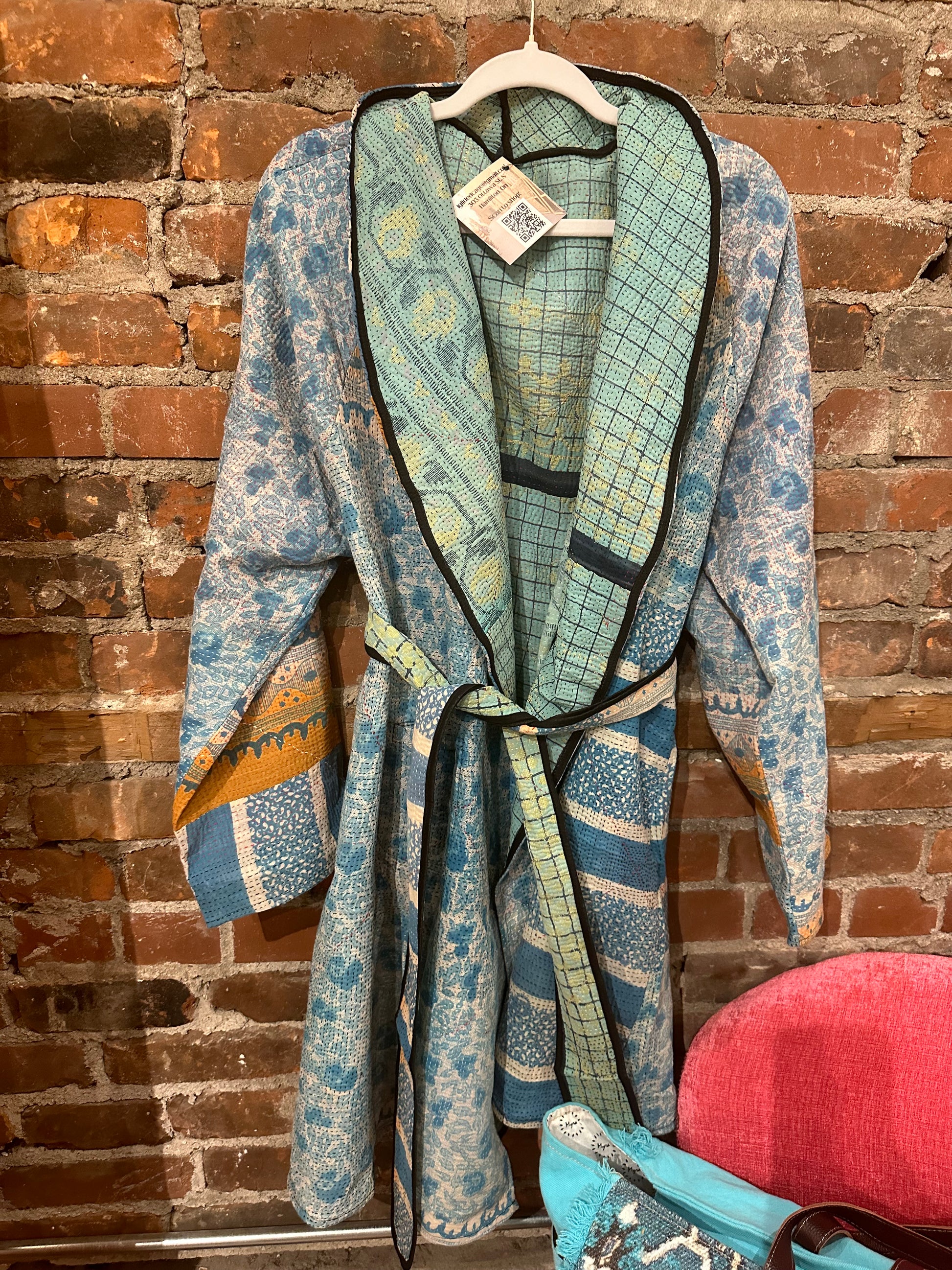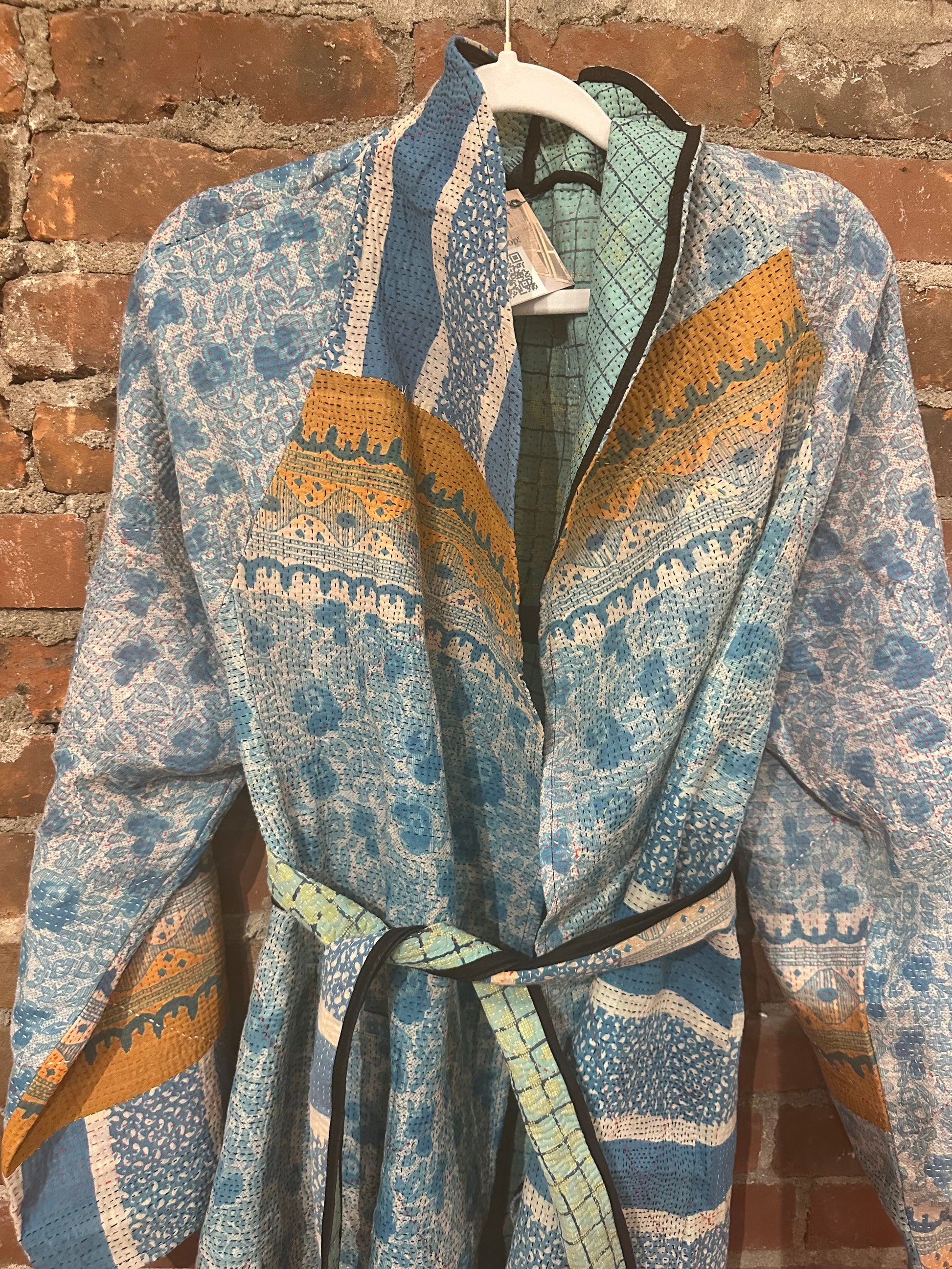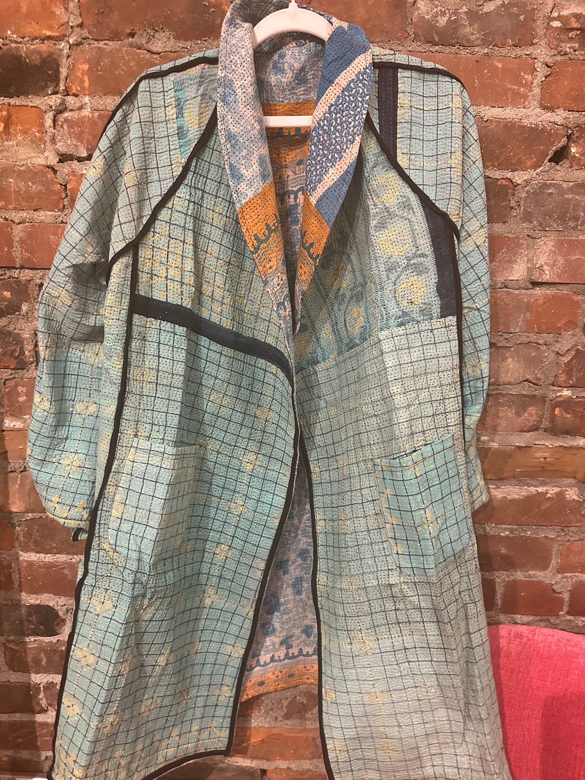 These stunning wearable art coats will become your signature look. Lovely little flare shape almost looks like a dress when belted. Every coat is intricately stitched and is reversible.